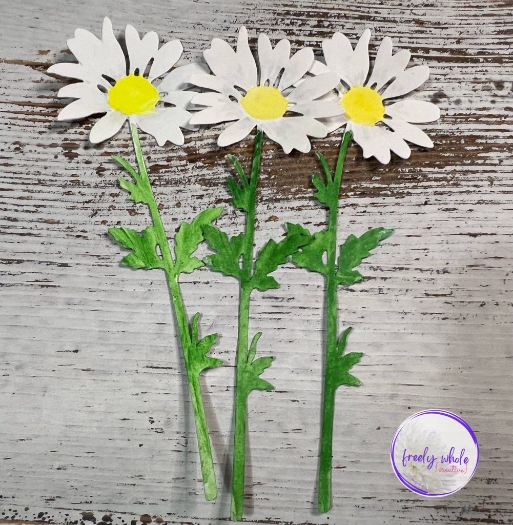 The background done. Moving on. A cheerful spring-y focal point to create a great compliment to it. Die cutting and watercolor pencils.
