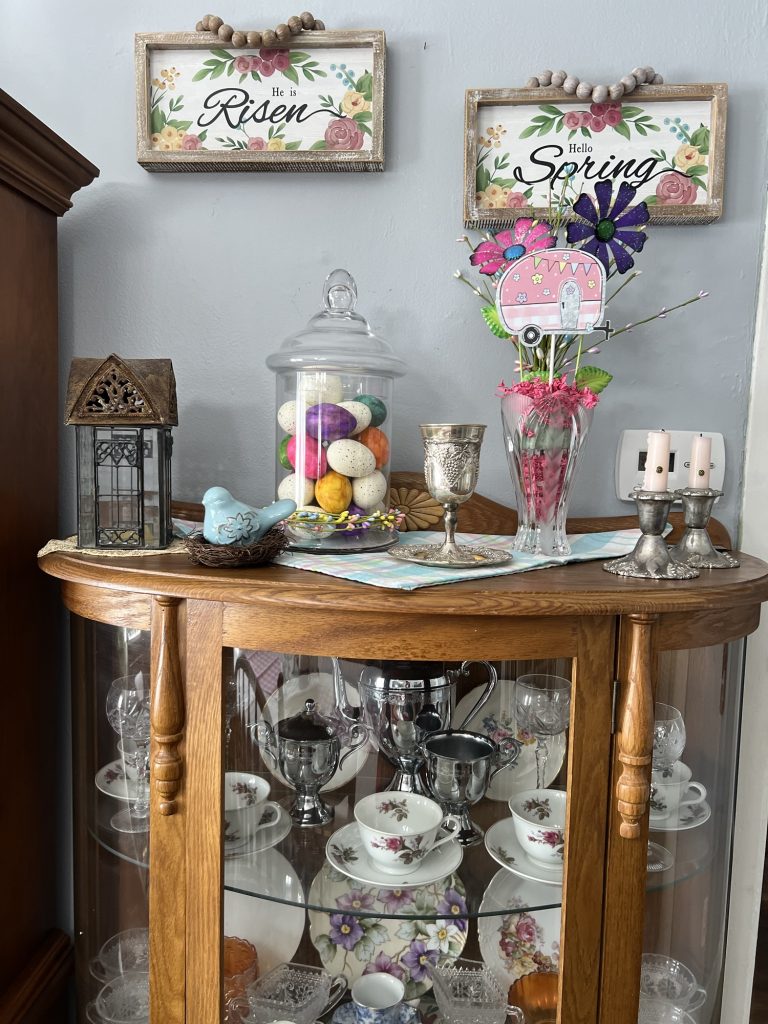 Thursday, I changed my seasonal home decor. Valentine’s came down, and Spring/Resurrection went up.