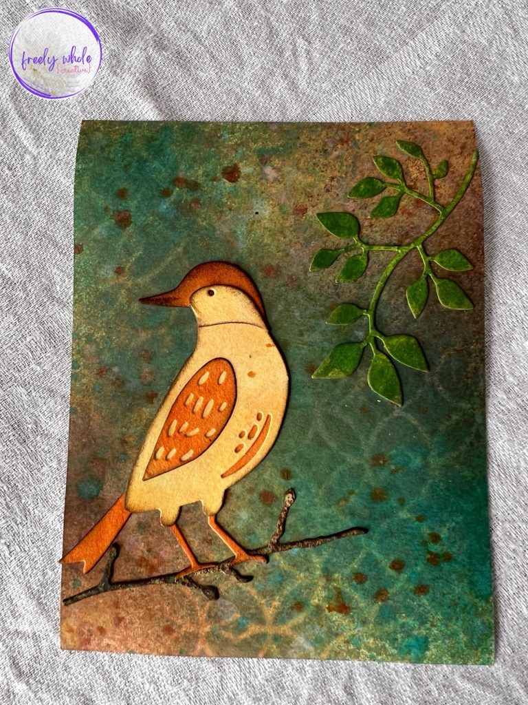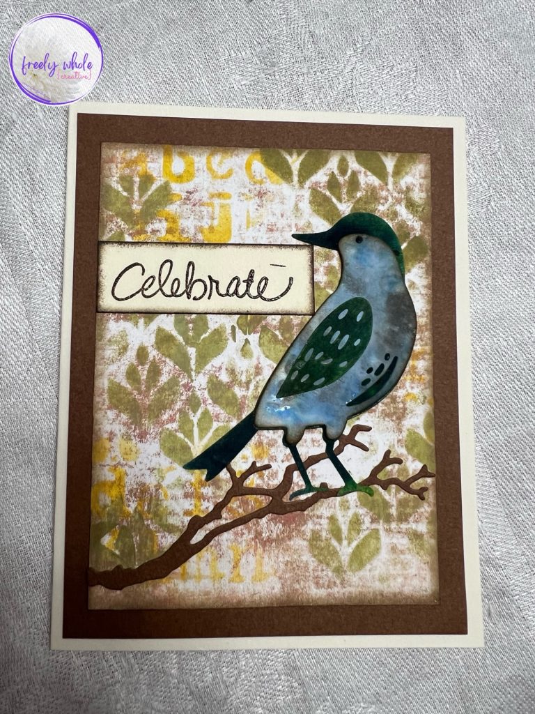 The other 3 birthday cards I made this month pull in more techniques and different styles. One, (the bird, like its sister art piece at the top,) uses similar die cutting and stamping, but a mixed media style background, including a variety of stenciling and background stamping.
