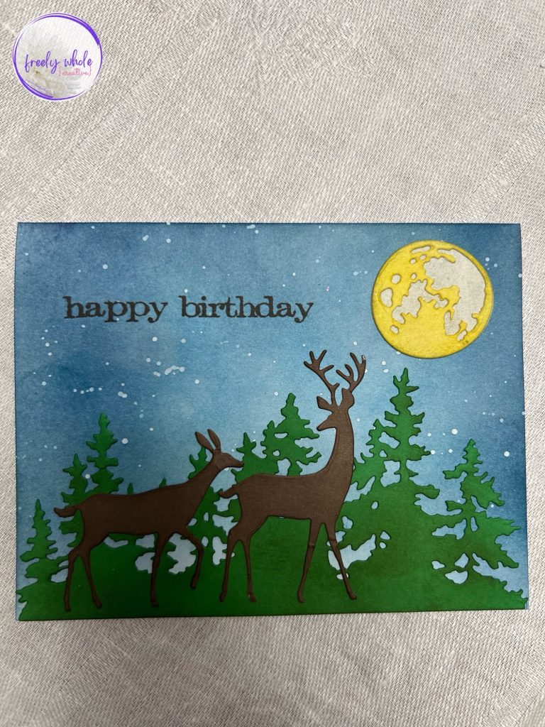 2 of the cards that I made a couple weeks ago, (deer and ice skates,) demonstrate that. Both utilize primarily inking and die cuts. The “simpler” card also includes stamping. The more complex card utilizes store-bought pattered paper. The opposite of what you’d expect.