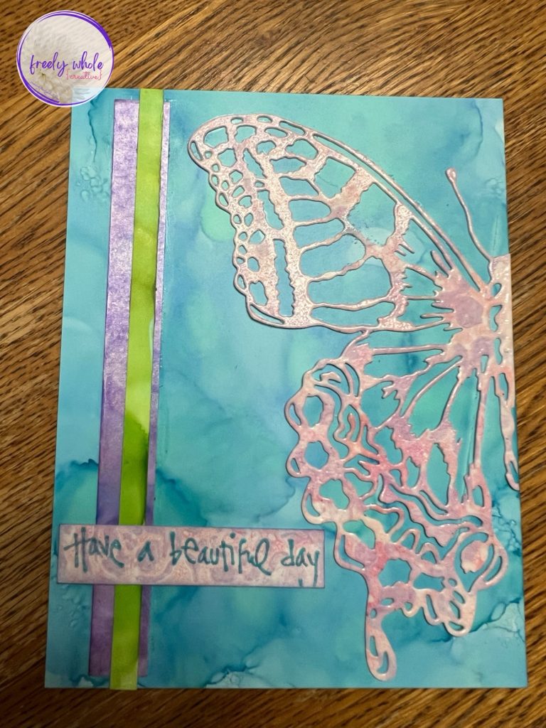 The other, (butterfly,) stamping and die cutting are present, but alcohol inked background and heat embossed focal point are a totally different style.