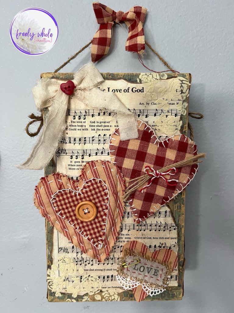 The hand sewn/quilted (and further decorated) hearts were put on an antique cigar box, that was too far damaged to use for storage. But first I white washed the box and decoupaged on a burnt hymn page—The Love of God, a favorite! ❤️ The bows, jute, and texture paste through a stencil added finishing touches.