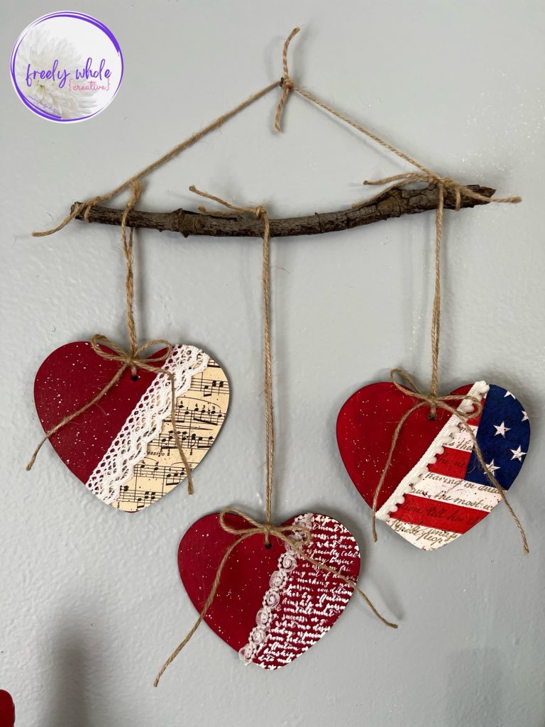 My next project was my wooden hearts. Paint, collage—music and napkin, stamping and heat embossing, splatters, ribbon, and bows made them just what I’d envisioned. But how to display them? I wasn’t sure. Until when I came home later that day and saw the perfect stick in the yard.